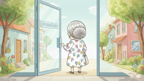 Remédio comprado, saiu da farmácia a dona Francisquinha.